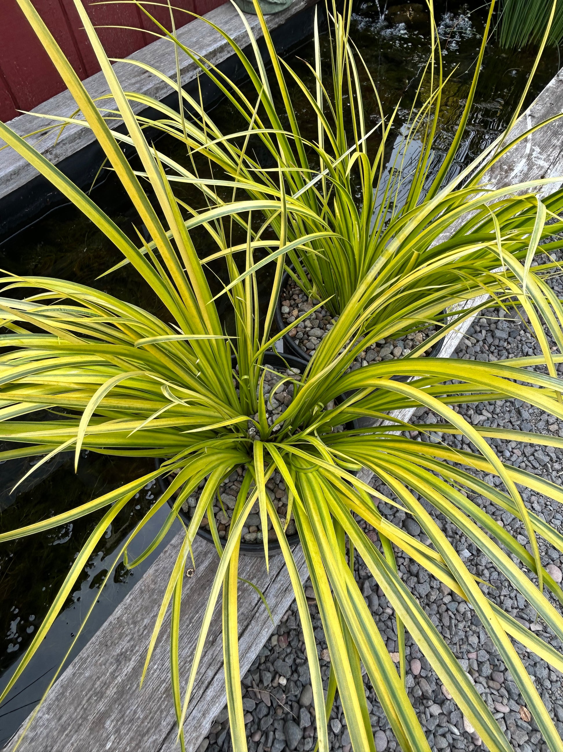 Low growing grass-like plant with brilliant green and yellow striping on the foliage. Seems to glow when placed in the sun. Evergreen. Bare root.