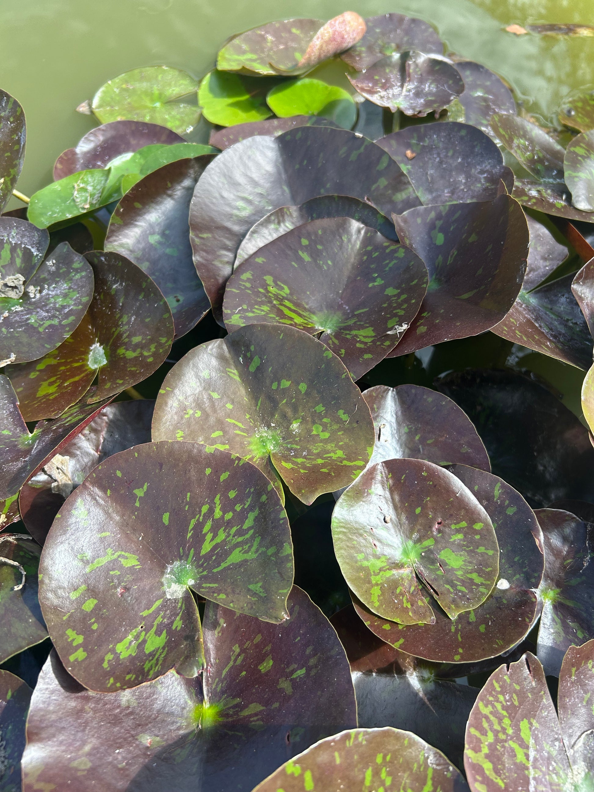 Water Lily with a medium-large peachy orange bloom with speckled yellow. Can produce variegated bloom, never seen in water lilies before. Green foliage with mottled purple specks. Water lilies are heavy feeders, enjoy fertilization throughout the growing season to ensure consistent blooms and full foliage. Go dormant in winter, return in the spring if over-wintered properly. Bare root.