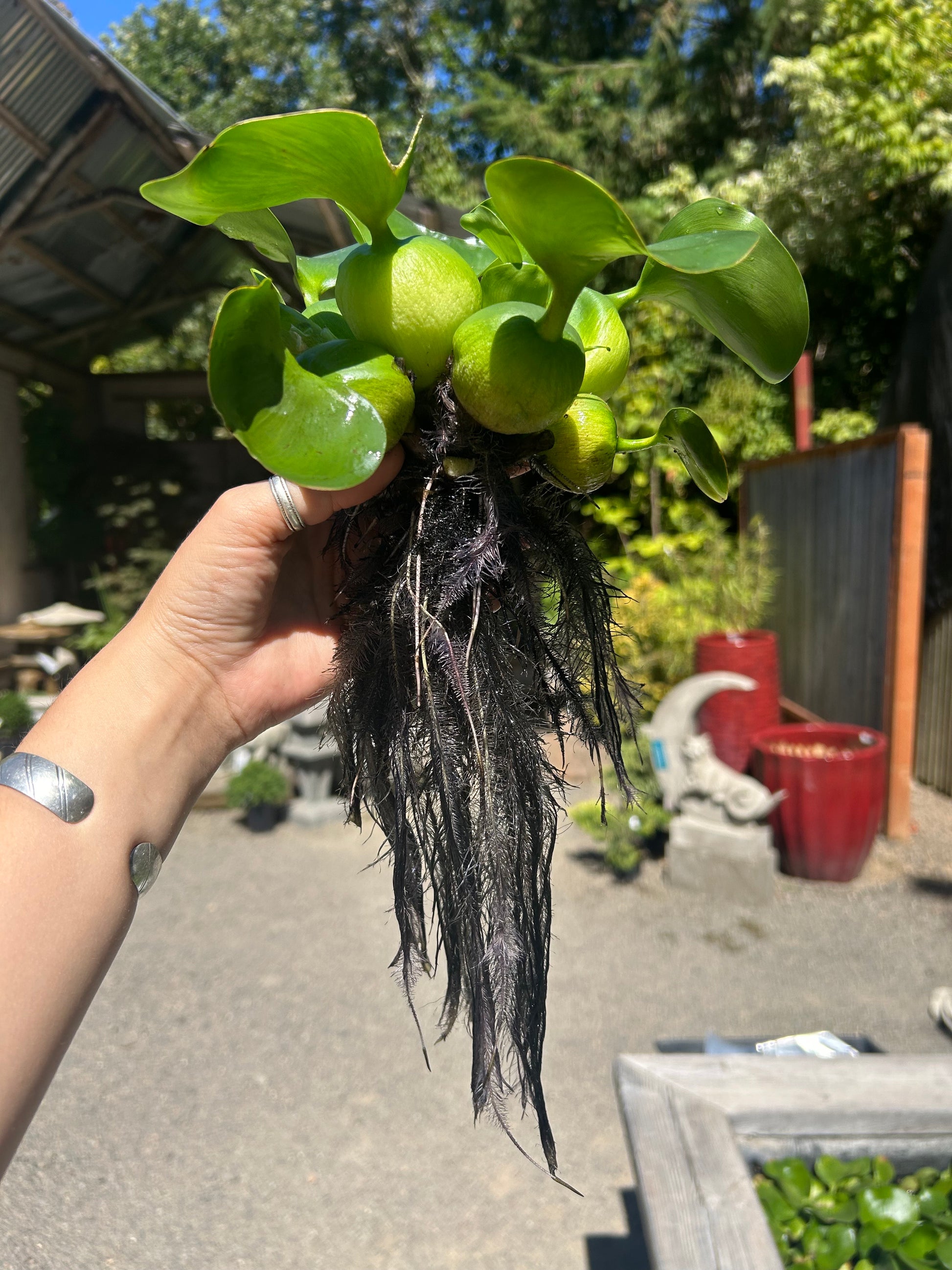 This free-suspended water plant has glossy, green bulbous leaves with delicate lilac blooms that last a day or two. Long, thick black roots trail below, providing good breeding grounds for fish and frogs. Hyacinth are especially good at absorbing excess nutrients in the pond, competing with algae. Prolific reproducer. Requires water 60 degrees and above, remove in the fall. Bare root.*